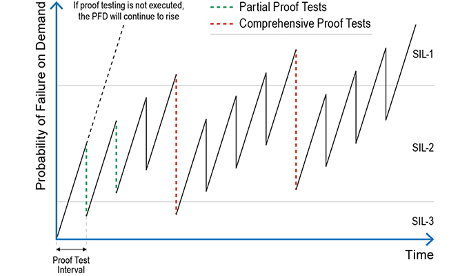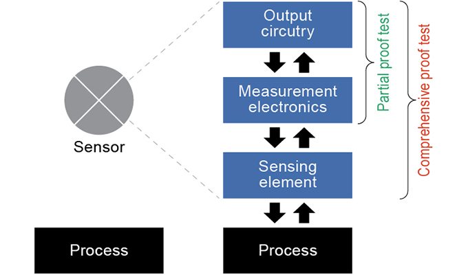 A comprehensive proof-test verifies all three functional elements of a device – output circuitry, measurement electronics and sensing element. A partial proof-test verifies one or two of them. A partial proof-test is performed to ensure that a device has no internal problems, and it will bring the PFD of a device back to a percentage of the original level and ensure that it fulfills its specified SIL requirement.